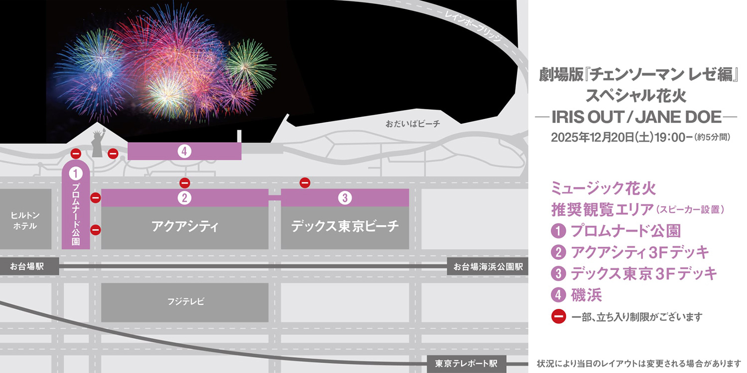 『チェンソーマン レゼ篇』と、「IRIS OUT」「JANE DOE」の大炸裂ヒットに感謝を込めて音楽にあわせたミュージック花火を、お台場レインボー花火とのコラボレーションで開催致します。